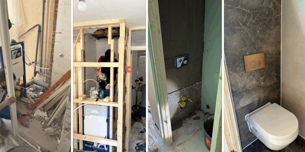 Het nieuwe toilet is van alle gemakken voorzien: een strak hangtoilet, grote 120×60 tegels, een geborsteld metalen bedieningspaneel, vloerverwarming en zelfs een stopcontact. Alles is vanaf nul opgebouwd, netjes weggewerkt en tot in detail afgewerkt. Het resultaat? Een modern, comfortabel toilet dat echt waarde toevoegt aan de woning en het woongemak een flinke upgrade geeft.