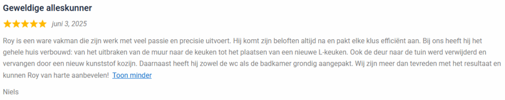 En dit alles resulteert natuurlijk in een tevreden klant – en een mooie beoordeling. Denkt u ook na over een verbouwing? Geen zin in een aannemer hier, een tegelzetter daar en nog acht andere partijen over de vloer? Kies dan voor één betrouwbare alleskunner die uw hele woning van A tot Z aanpakt. Neem snel contact op met Bouwbedrijf Rubeling – wij maken het u makkelijk.