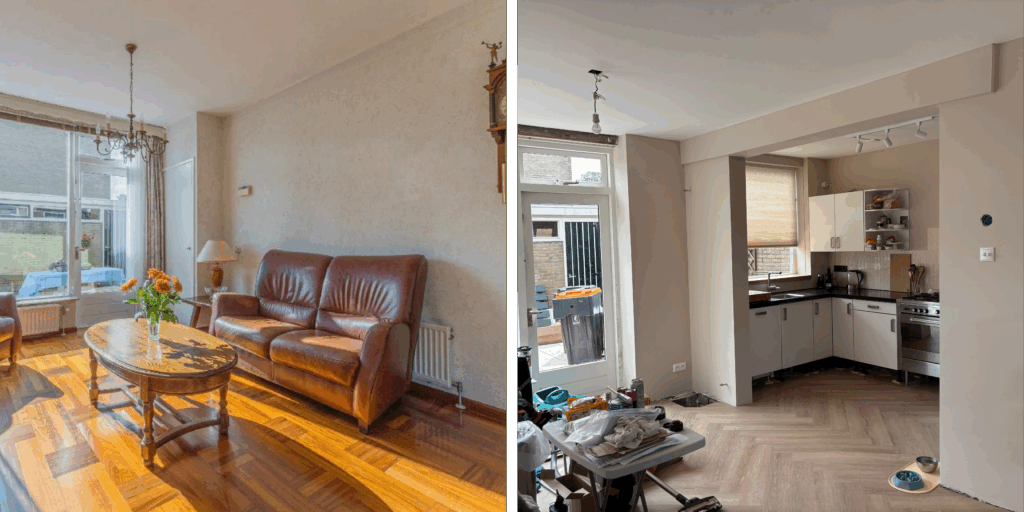 In Heerhugowaard hebben we een woning uit 1963 compleet onder handen genomen. De bewoners wilden meer licht, ruimte en comfort, en dat is precies wat we samen hebben gerealiseerd. We begonnen met het verwijderen van de muur tussen de keuken en de woonkamer. Daardoor ontstond één grote, open leefruimte met veel meer licht en een prettige, ruimtelijke sfeer. Ook hebben we de oude deur en het raam naar de tuin vervangen door een groot kunststof kozijn met triple glas. Dat zorgde niet alleen voor extra lichtinval, maar maakte het ook mogelijk om een ruime L-keuken te plaatsen onder het raam – praktisch én stijlvol.