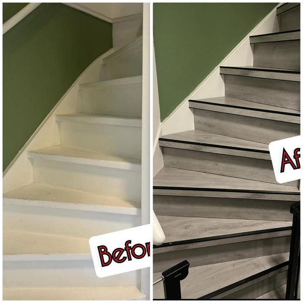 “Klant heeft ons gevraagd om de trap opnieuw te bekleden. Wij hebben de trap eerst helemaal geschuurd, en renovatie-klaar gemaakt voordat we de nieuwe trapbekleding van PVC op maat hebben gemaakt en op de trap hebben gelijmd. Tot slot hebben we de trap afgewerkt met sier- en stootstrips voor een optimaal eindresultaat.”