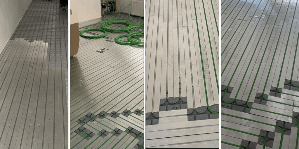 Zwaluwstaartplaten, broodjesvloer, vloerverwarmingsslangen (systeem)